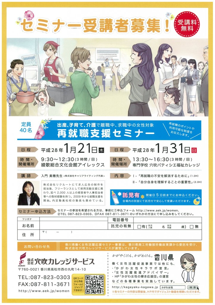“出産、子育て、介護で離職中の女性再就職支援セミナー”の講師を担当します。